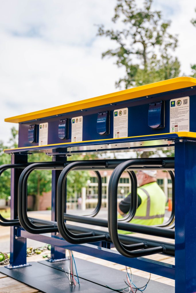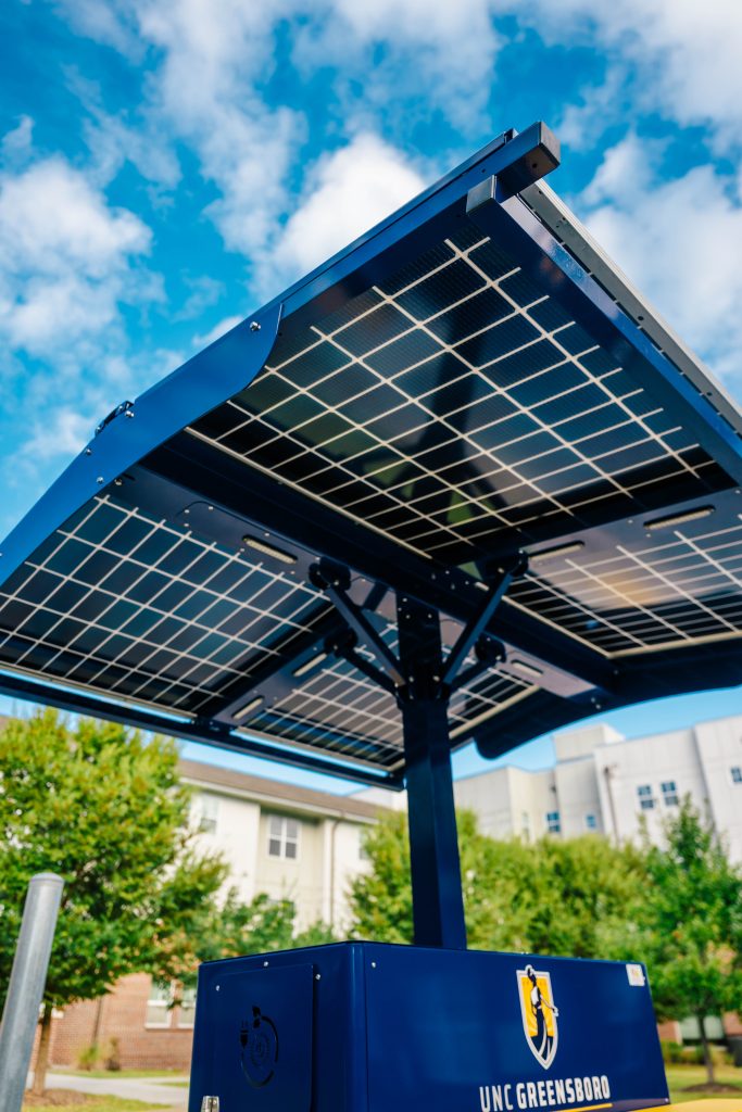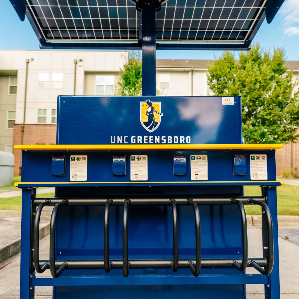 UNC Greensboro has installed solar-powered charging stations at two locations for students to recharge their micromobility devices. It’s a partnership between several University departments: UNCG Parking Operations and Campus Access Management, Campus Enterprises, Housing & Residential Life, and the UNCG Green Fund administered by the Office of Sustainability.